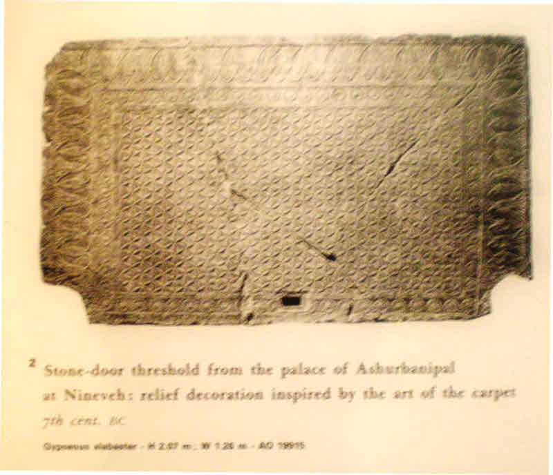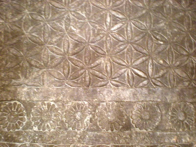 The oldest known example of the 'Flower of Life' design comes from the palace, in Nineveh, of the Assyrian king Ashurbanipal and is dated to c.645 BCE. This design in gypsum/alabaster formed a doorway threshold to the palace and is thought to have represented a carpet. This piece measuring 2.07 x 1.26 m can now be seen in the Assyrian rooms of the Louvre Museum in Paris.